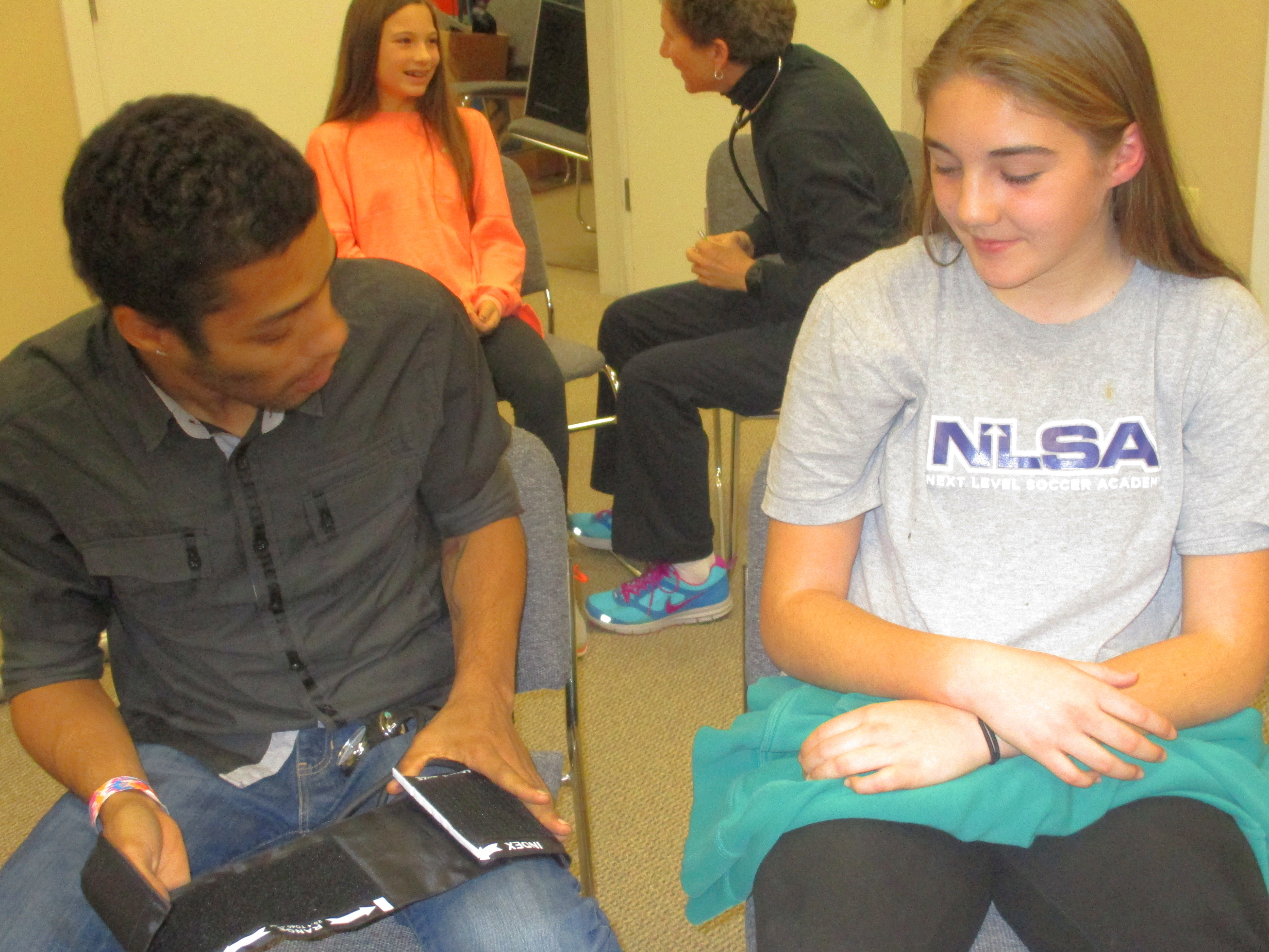 EMT student Ian Green practices interviewing pediatric patient
